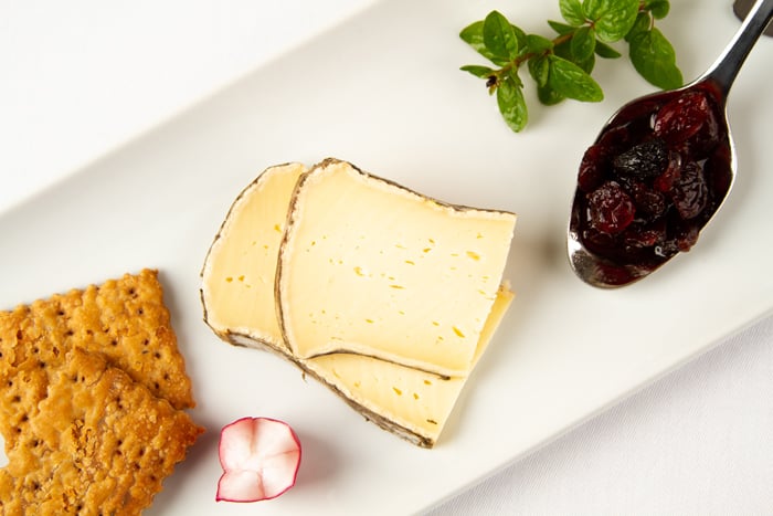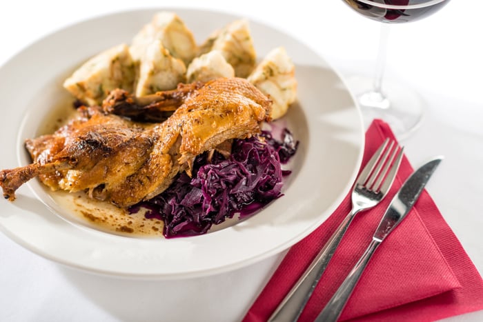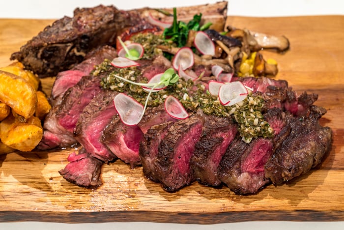 Vi serverer rejecocktail, oksefilet med pommes frites og bearnaisesauce.
